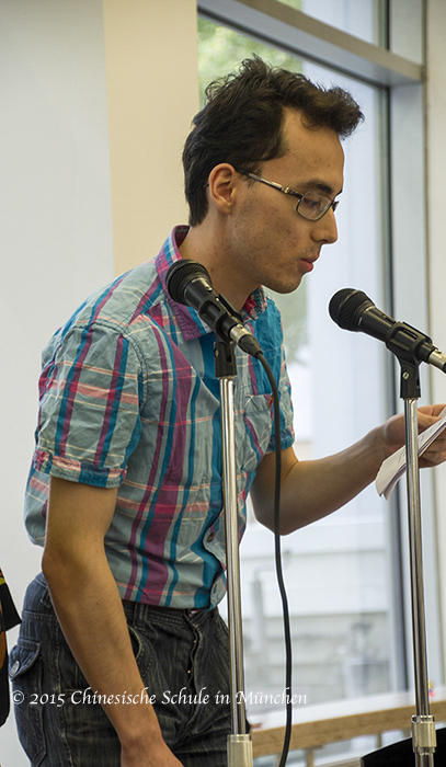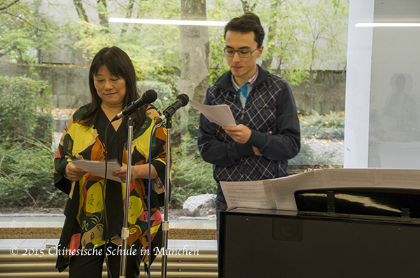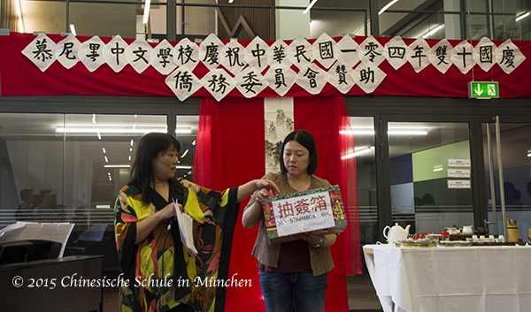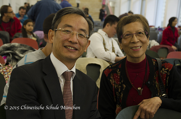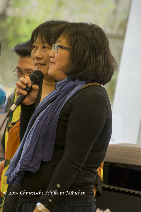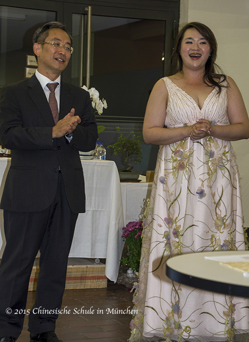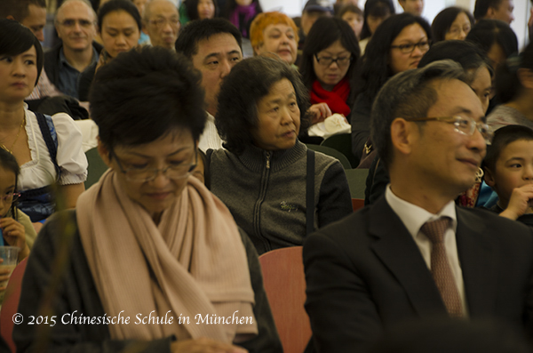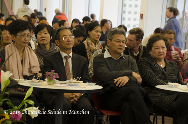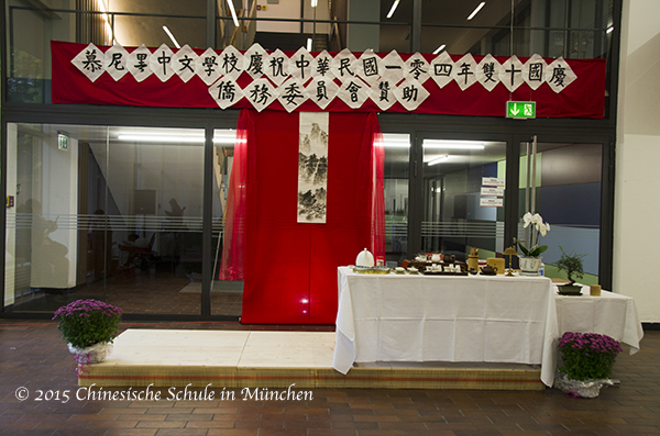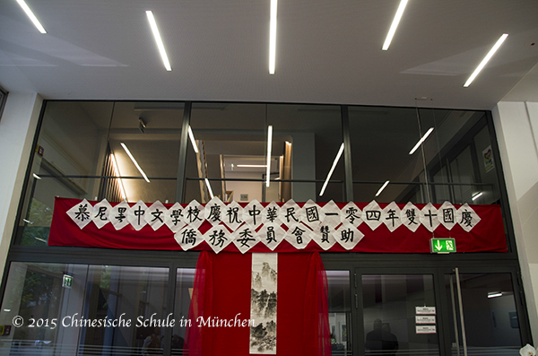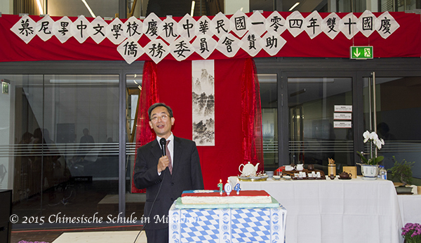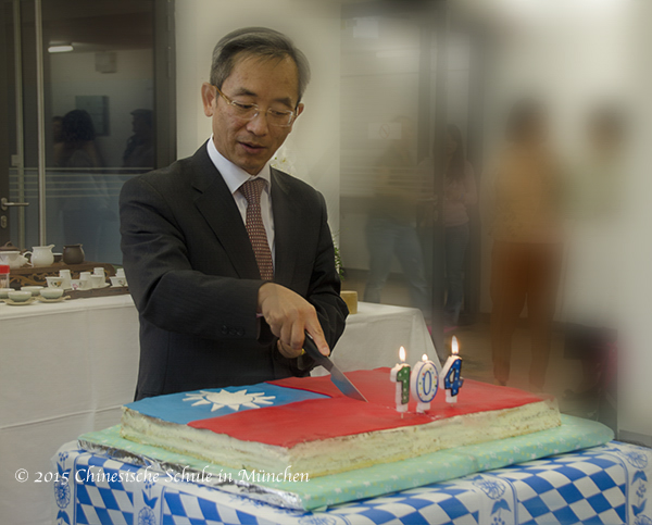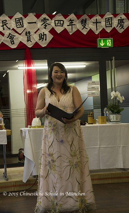 Die neugewählte Schulleiterin Frau Gloria Chang hieß alle Gäste herzlich willkommen, deutete mit der alten chinesischen Redensart „Alle Menschen in der Welt sind verbrüdert.“ das heutige Beisammen als einmalig und wünschte allen Anwesenden viel Spaß und guten Appetit. Gleich darauf wurden die neuen Vorstandsmitglieder dem Publikum vorgestellt. Darauf folgte die Begrüßung des Generaldirektors des Taipeh Vertretungsbüros München, Herrn David Chang. Ihm war recht bedeutungsvoll, dass er zusammen mit seinen Landsleuten im Ausland die Nationalfeier feierte. An dieser Stelle wünschte er, dass die Republik China für immer von Frieden und Wohlstand umgeben ist, und lobte Taiwan als Land, in dem sich die chinesische Kultur gut erhält.