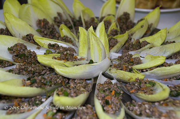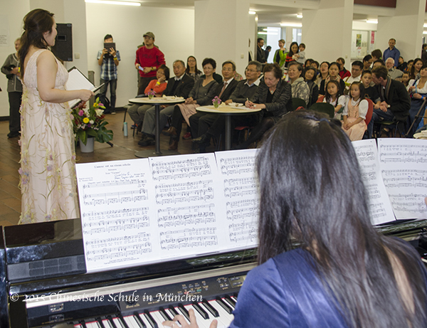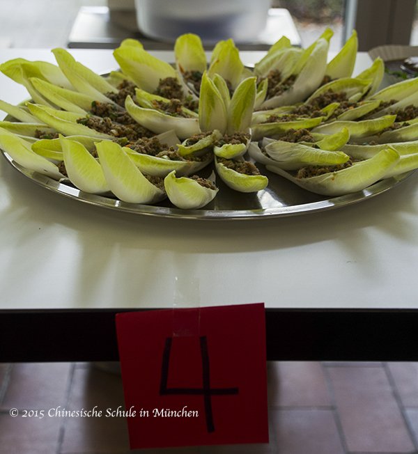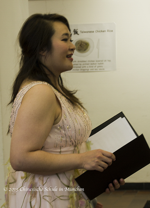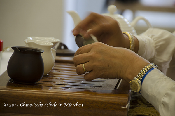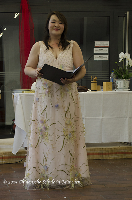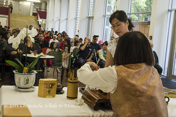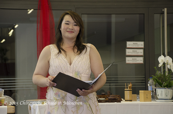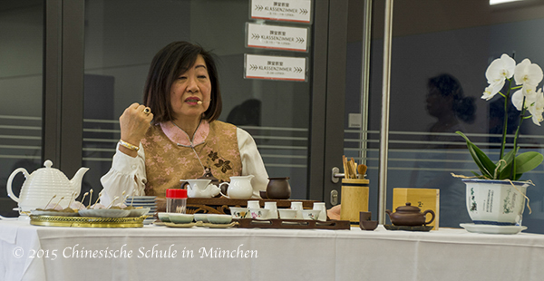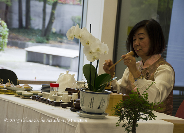 Das Programm begann mit der Gesangdarbietung von Frau Shi Yiqiao, dem Mezzosopran aus dem Ulmer Theaterhaus. Sie stellte mit ihrer Virtuosität das berühmte Volkslied „Jasminblüte“ dar. Im Anschluss daran wurden 5 Schiedsrichter aus dem Publikum ausgewählt, um gemeinsam mit den Ehrgästen die Gerichte zu bewerten. Frau Tiny Bohmann- Chen, die bekannte Teekennerin der CSM führte das Publikum vor, wie man guten Tee kocht und verriet dem Publikum ihre Geheimtricks.