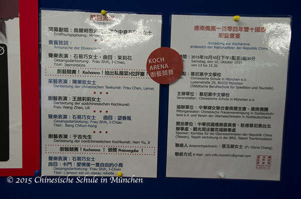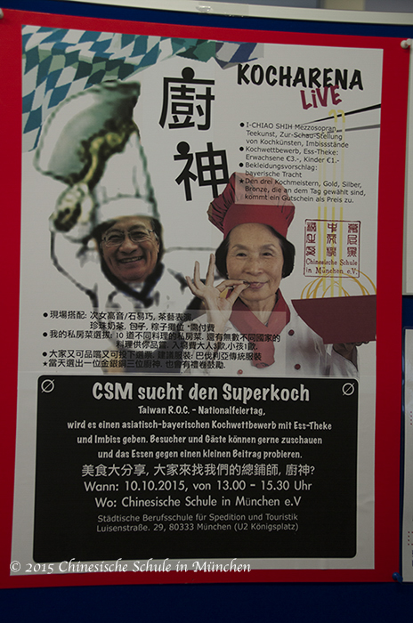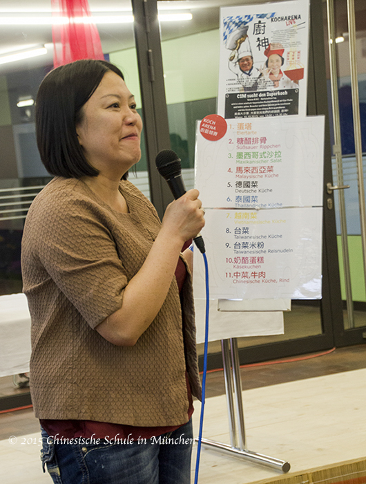 Das Veranstatungsmotiv hieß „Kocharena“. Es handelte sich hier um eine wundervolle Kochveranstaltung, bei der der kulturelle Austausch zwischen Bayern und Taiwan durch die bayerische traditionelle Esskultur und vielfältige Speiserrichtungen taiwanesischer Art gefördert wurde. Ohne Mitarbeit der chinesischen Frauenvereinigung in Süddeutschland und des Vereins der Überseechinesen hätte die CSM allerdings die Feier nicht auf die Beine stellen können. Der Moderator Hualing bedankte sich im Namen der CSM bei dem Komitee für die Überseechinesen der Republik China, dem Taipeh Vertretungsbüro München und dem Tourismusbüro in Frankfurt für ihre tatkräftige Unterstützung.