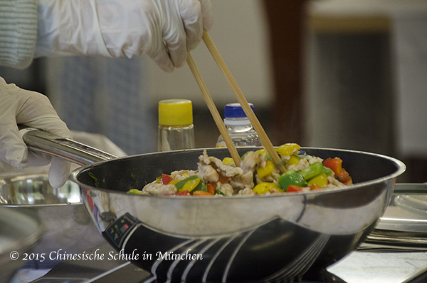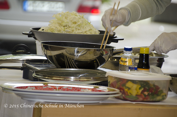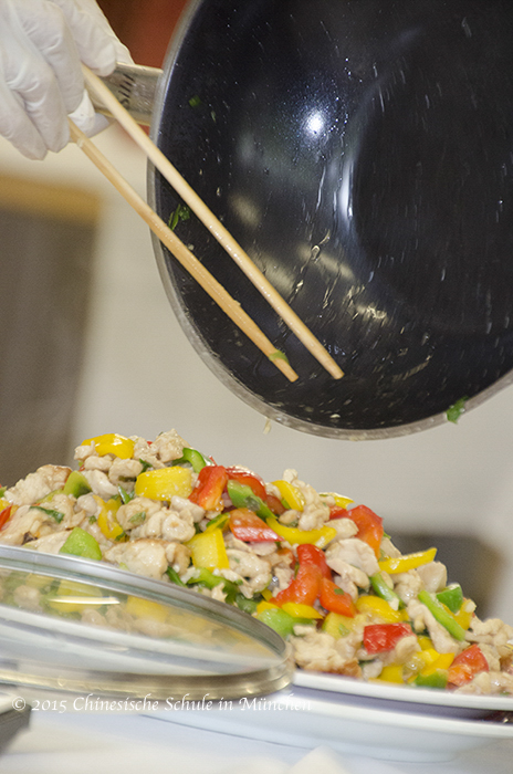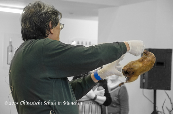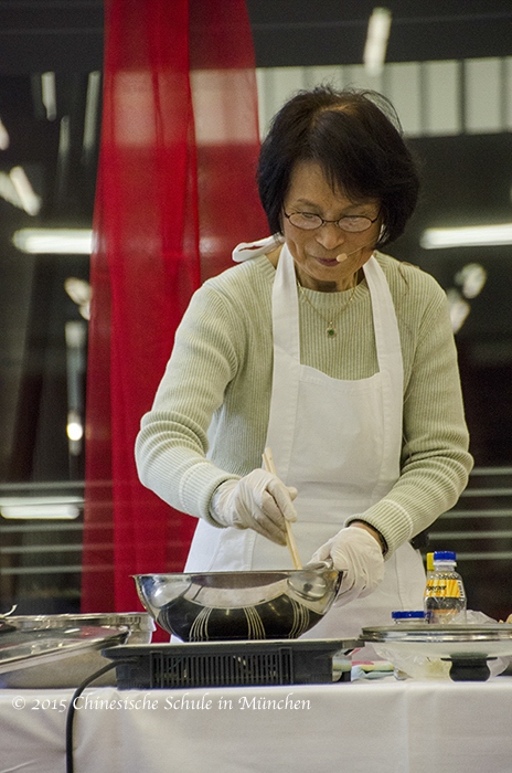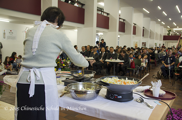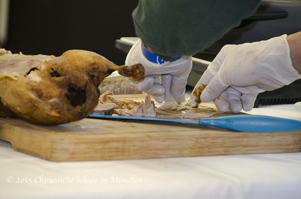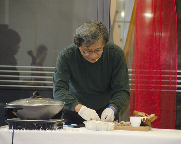 Da Essen in jeder Landeskultur eine wichtige Position einnimmt, führte Frau Lili Wang-Zhao in voller Aufregung dem Publikum vor, wie man ein authentisches südchinesisches Gericht hinzaubert, Herr Steve Yu hingegen führt dem Publikum vor, wie man eine Ente backt, damit sie aromatisch riecht und so authentisch wie Peking Ente schmeckt.