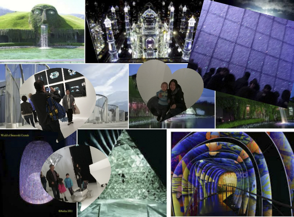 裏頭有35個展場,我們在每個展場中穿梭,一會兒來到錯置空間,不同照片與形狀結合,營造現代藝術的震撼,一會兒來到鏡室,鏡子與柱子互相錯置圍繞,好像整個空間摸不著邊際,讓小朋友們十分興奮的繞來繞去,好不開心.一會兒又在光彩奪目的水晶雕塑下,盯著光彩奪目的城堡或皇宮,讓人有無限想像!每個展場各有特色,尤其化水晶為藝術,在雕塑、服裝設計、珠寶設計...等,是最令人印象深刻而佩服.