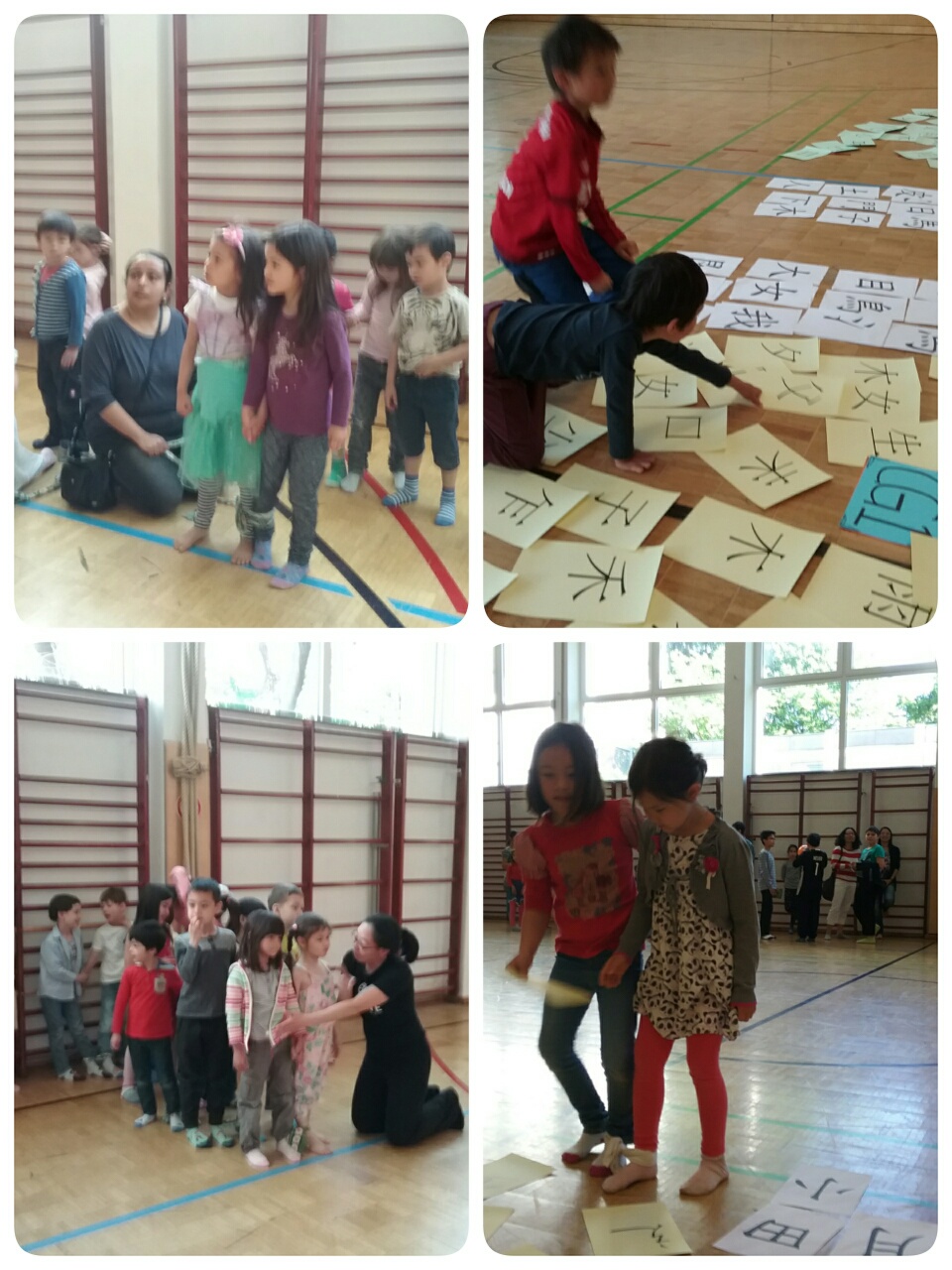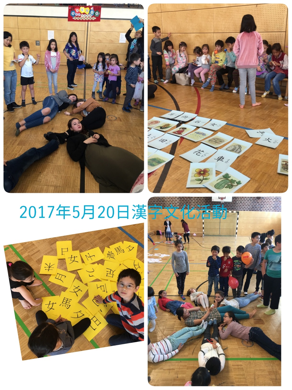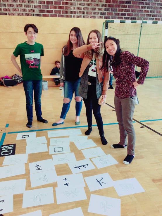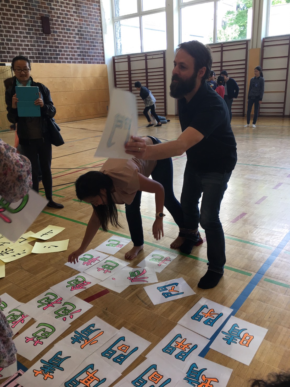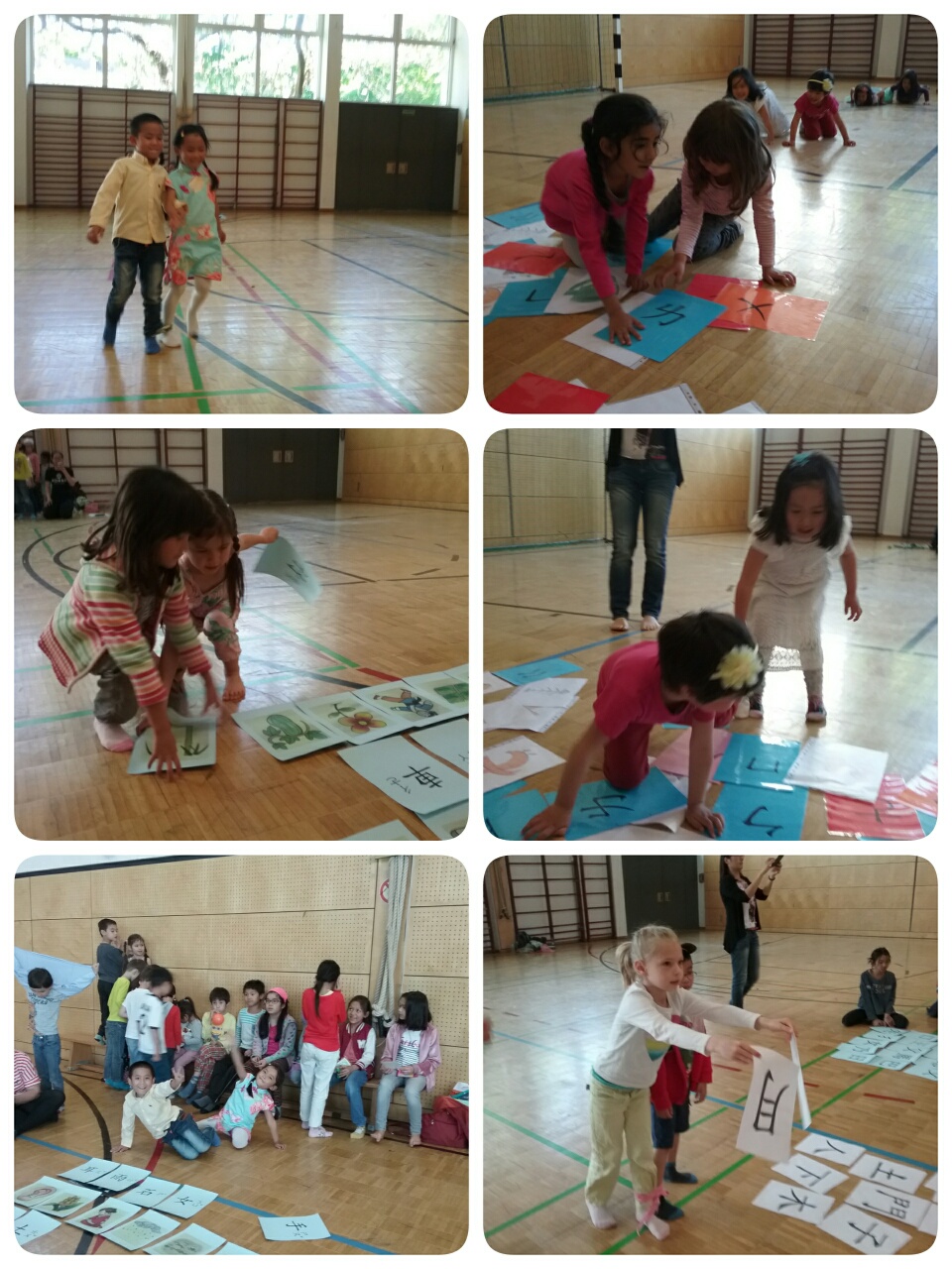 人體排字遊戲也讓孩子們玩得很投入。要把漢字用身體排出來可不是件容易的事,老師幫忙著彎曲著孩子的身體, 孩子們還得維持著相同的角度, 不能亂動直到其他人猜出來, 幸好所有的孩子都很厲害, 一下子就把排的字給猜出來了, 讓排字的孩子可以馬上輕鬆一下。