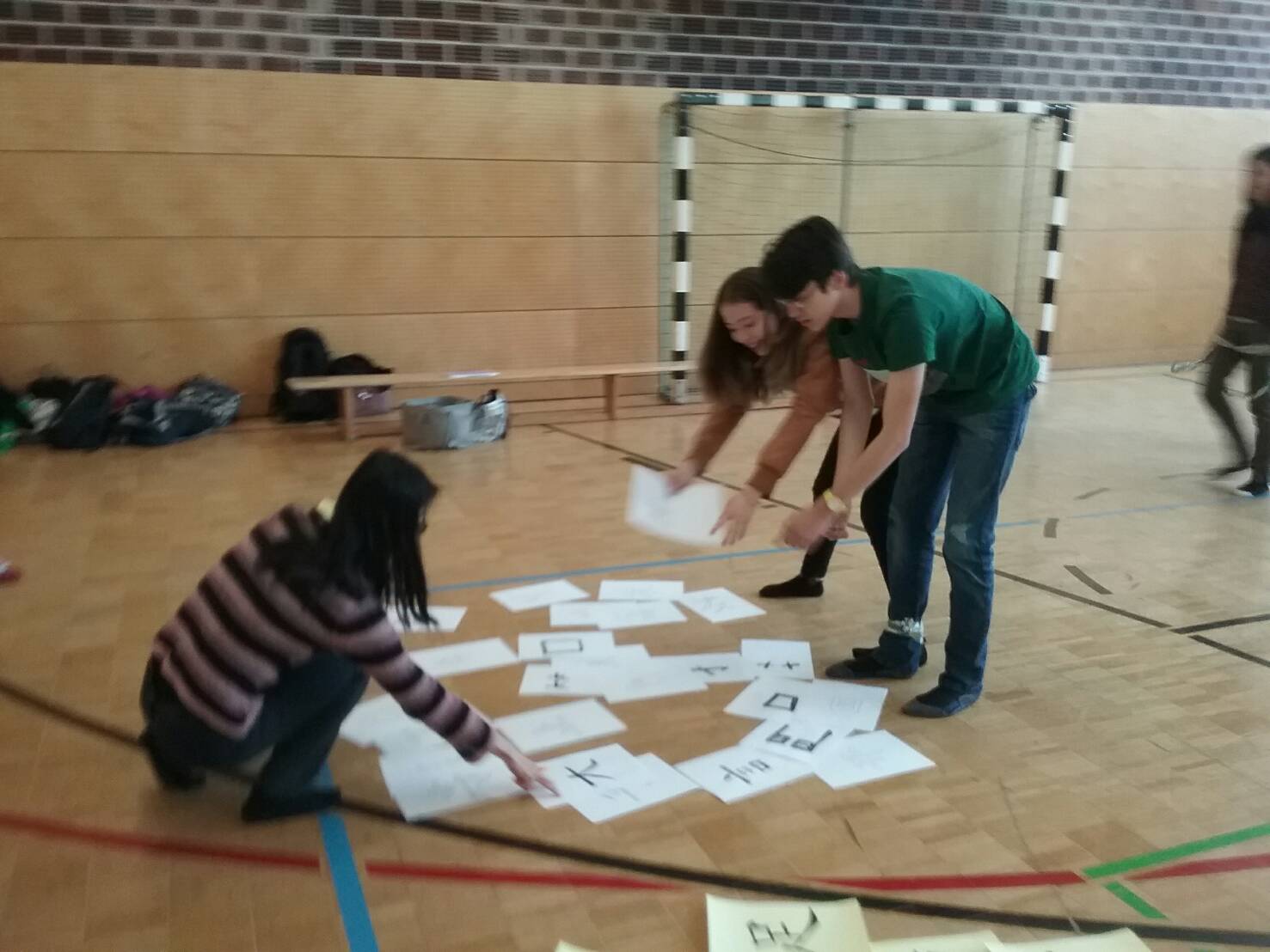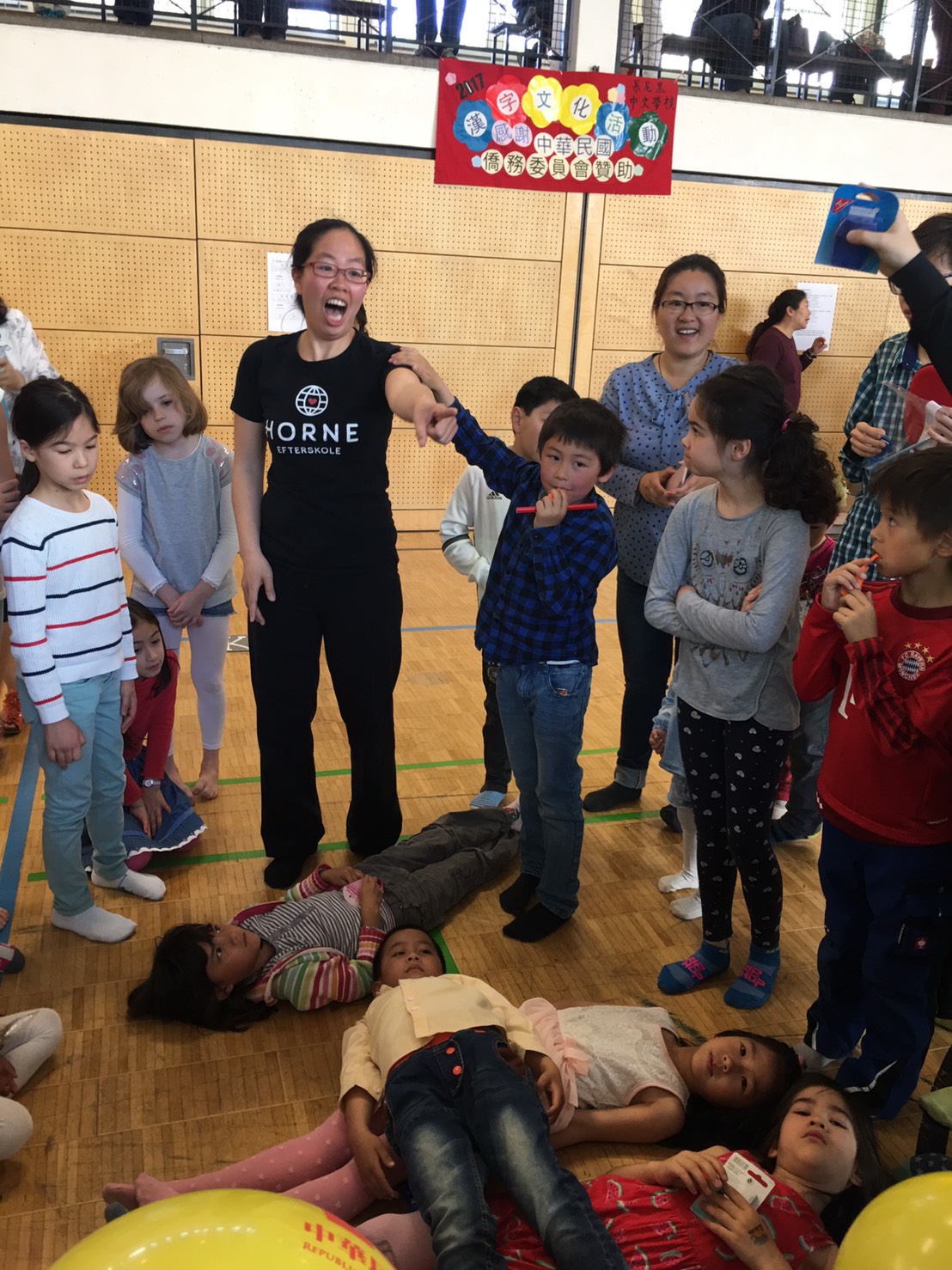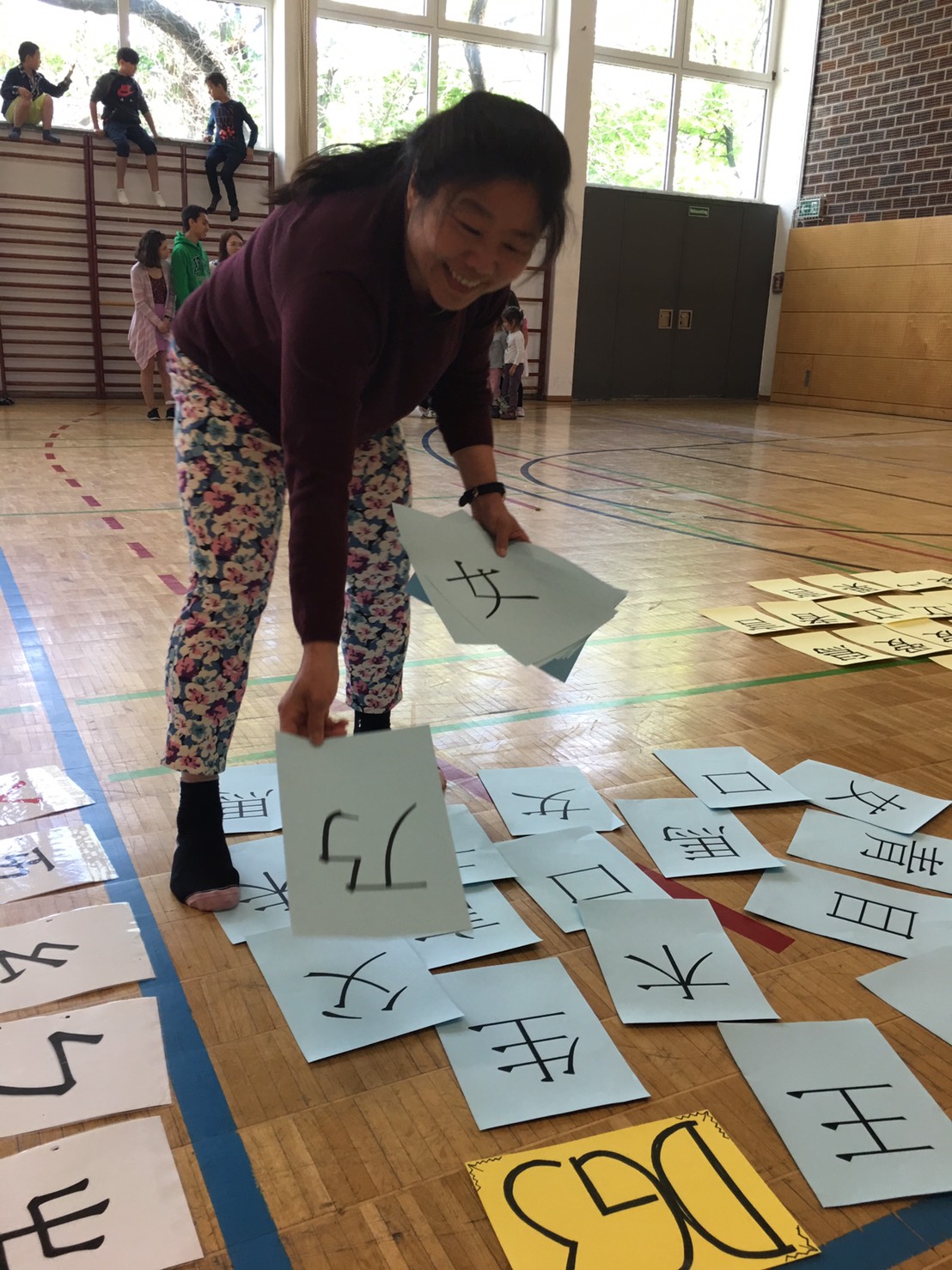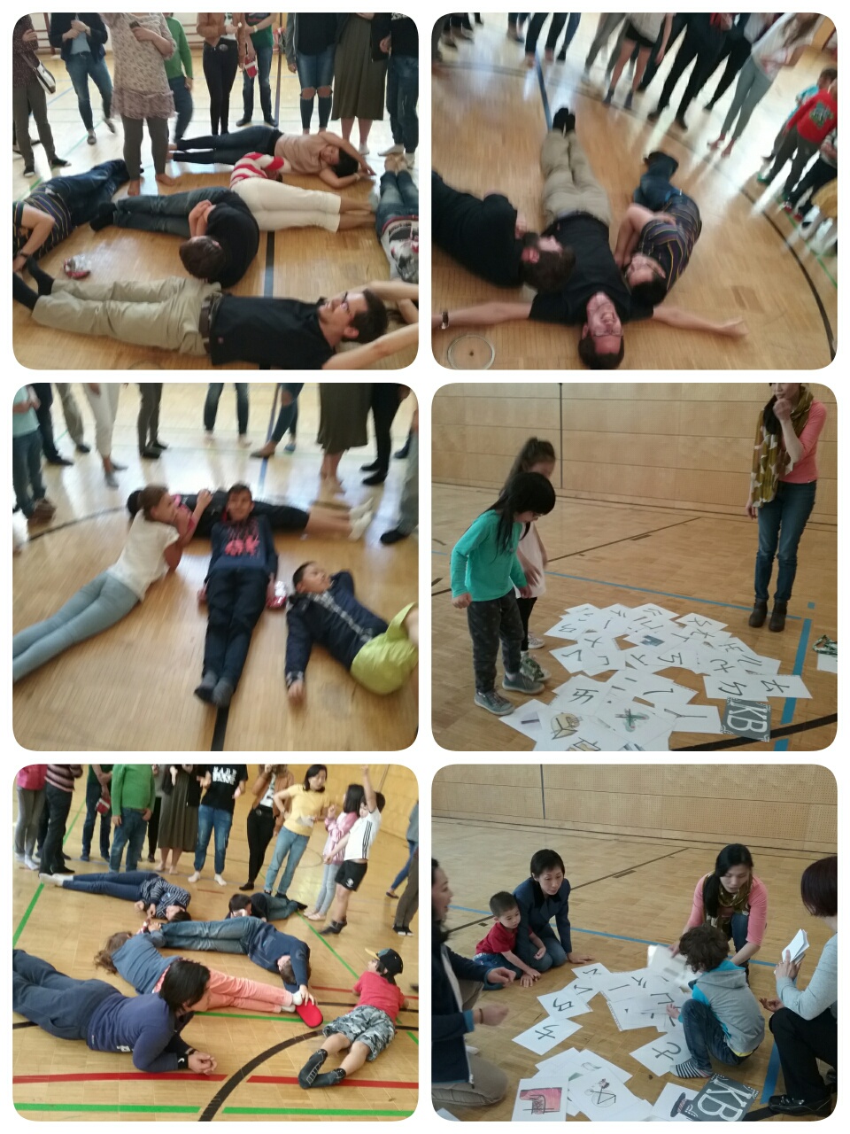 人體排字遊戲也讓孩子們玩得很投入。要把漢字用身體排出來可不是件容易的事,老師幫忙著彎曲著孩子的身體, 孩子們還得維持著相同的角度, 不能亂動直到其他人猜出來, 幸好所有的孩子都很厲害, 一下子就把排的字給猜出來了, 讓排字的孩子可以馬上輕鬆一下。