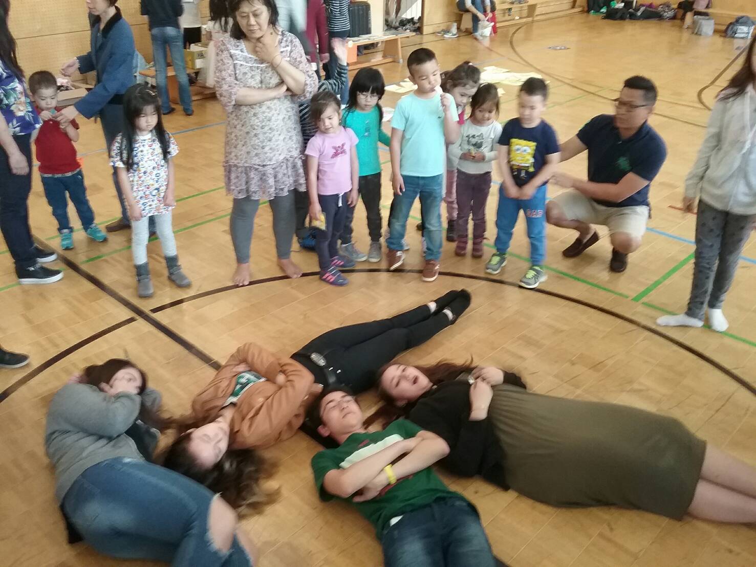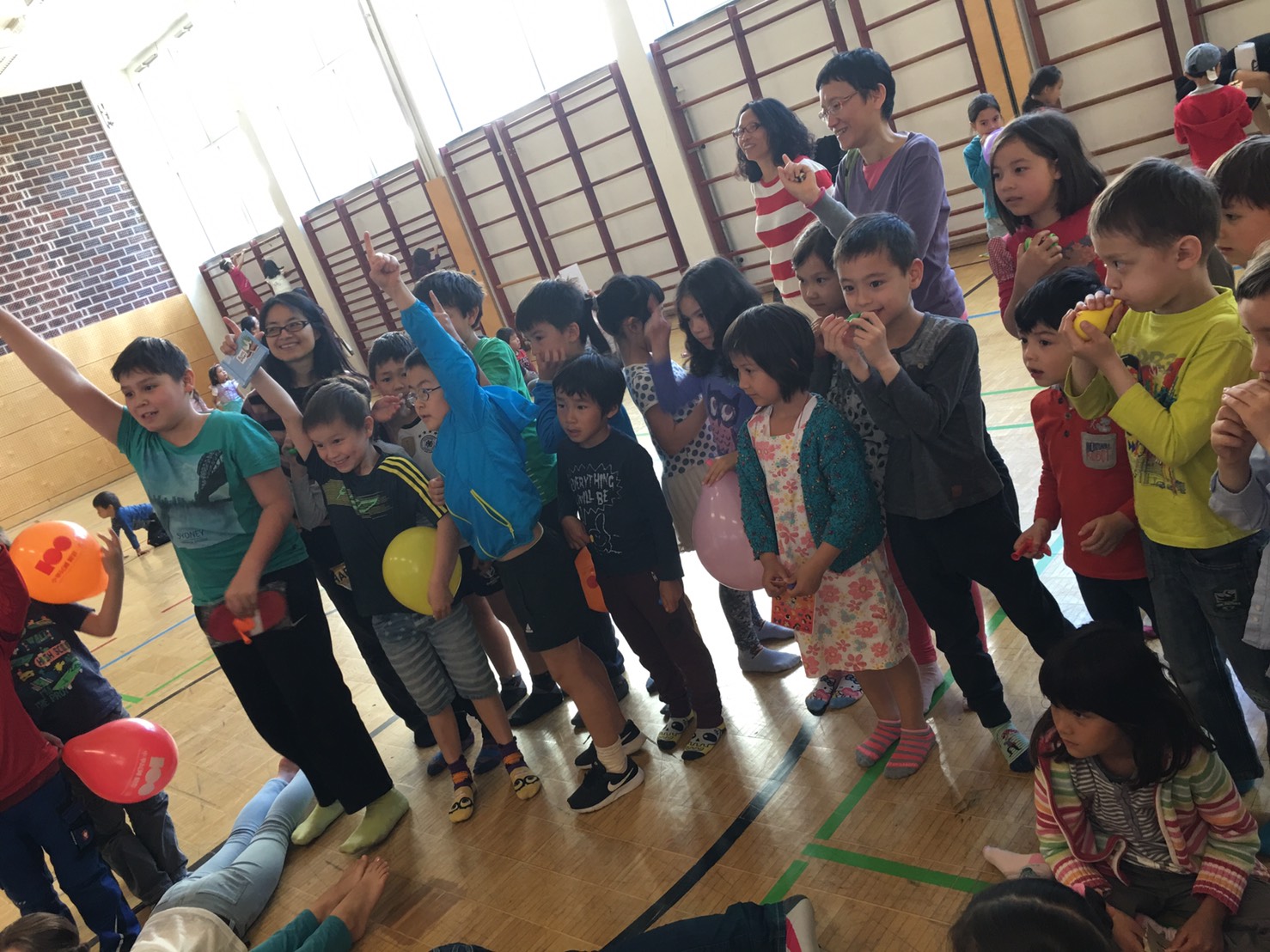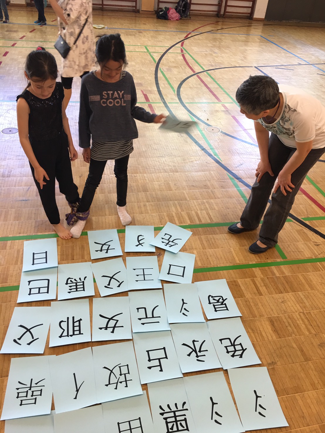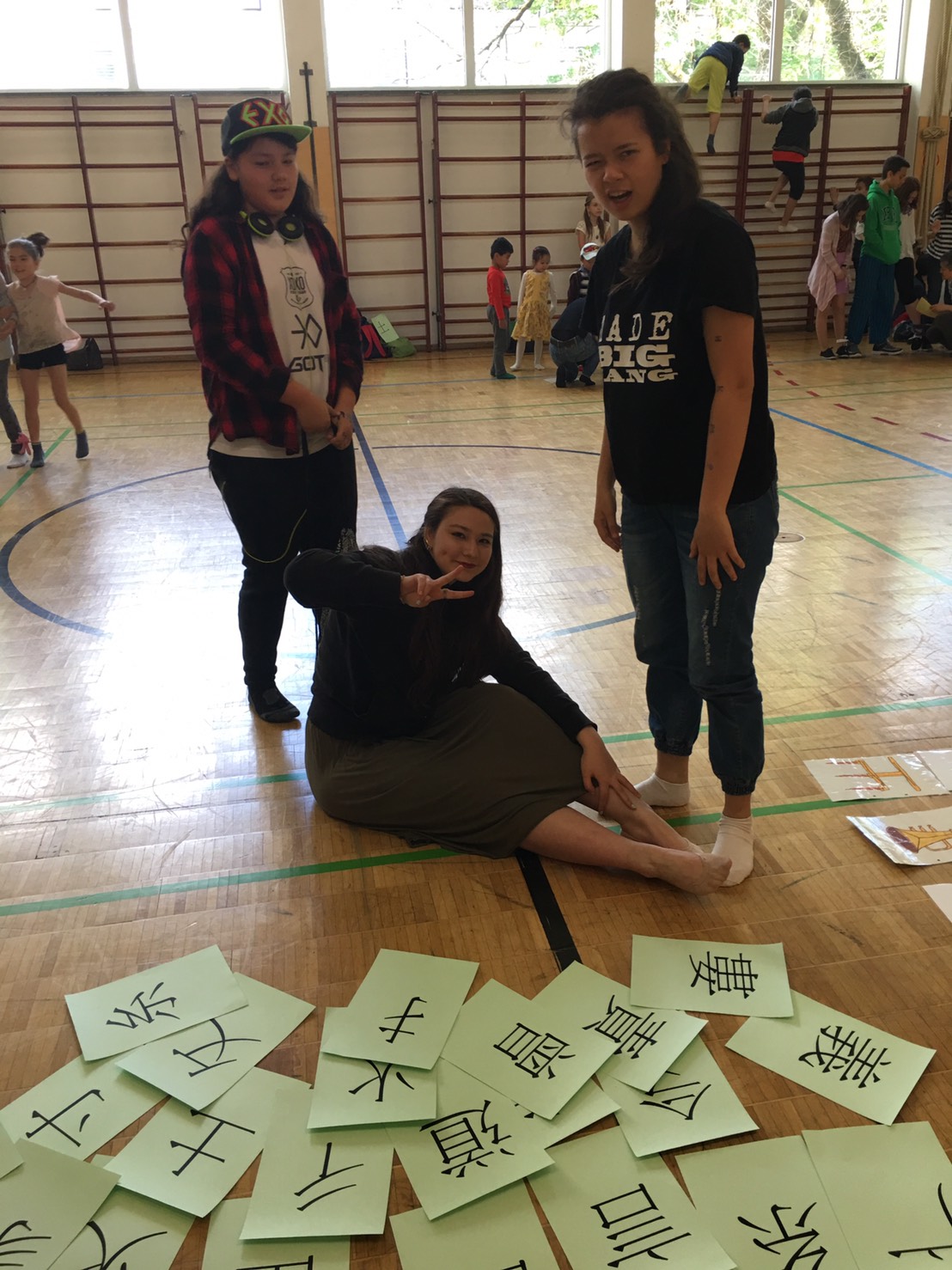 人體排字遊戲也讓孩子們玩得很投入。要把漢字用身體排出來可不是件容易的事,老師幫忙著彎曲著孩子的身體, 孩子們還得維持著相同的角度, 不能亂動直到其他人猜出來, 幸好所有的孩子都很厲害, 一下子就把排的字給猜出來了, 讓排字的孩子可以馬上輕鬆一下。