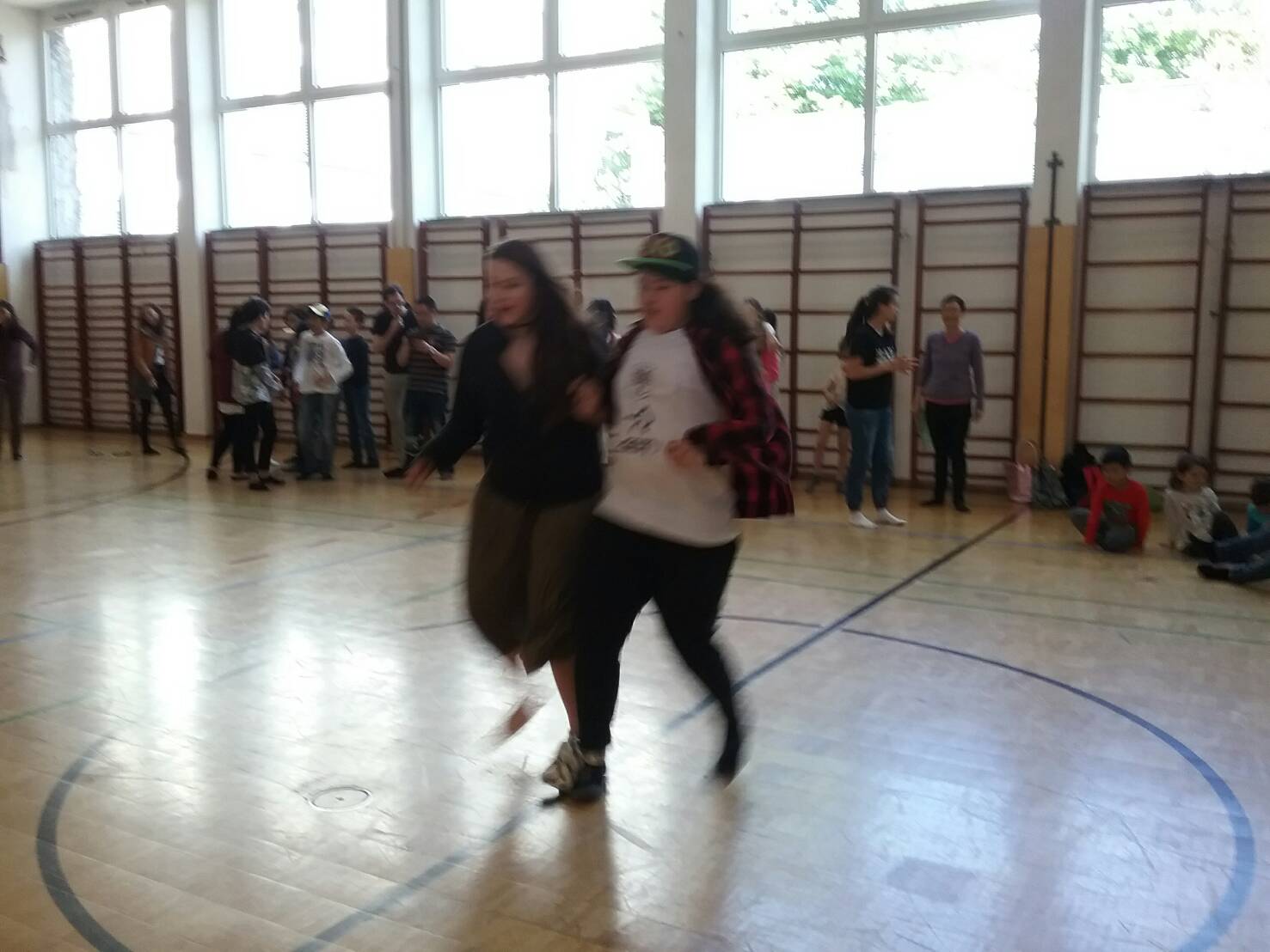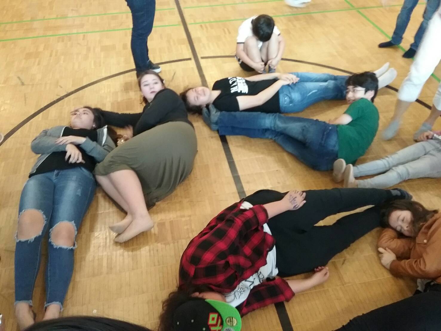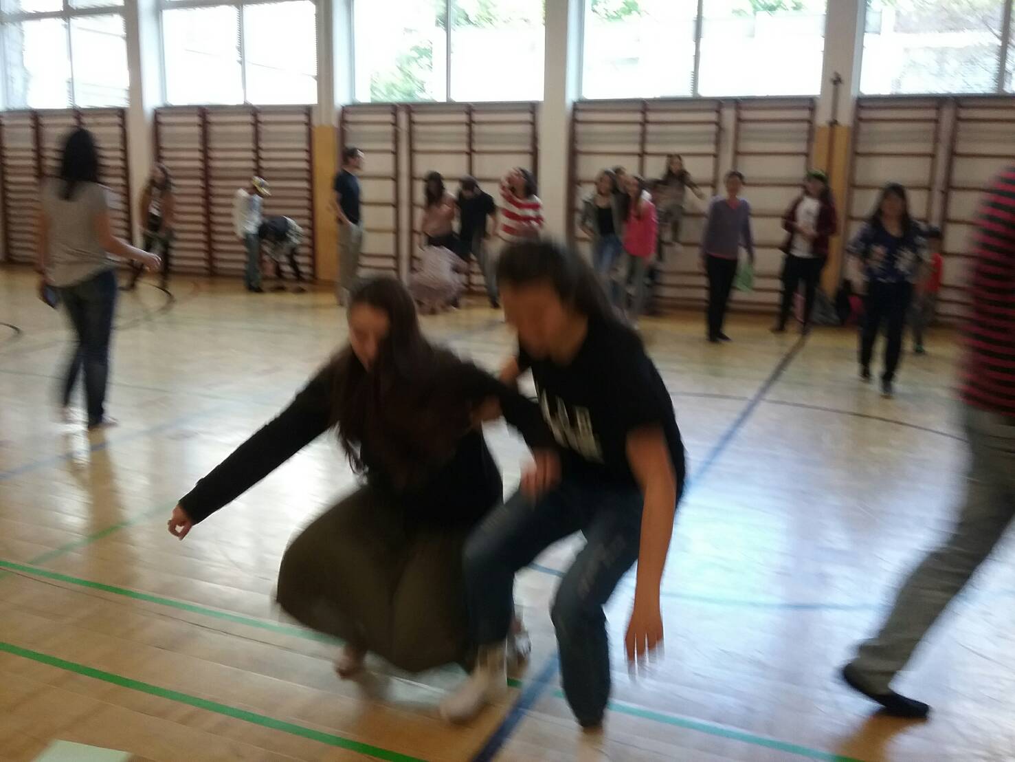 學員有各式各樣的年紀, 對很多學員來說, 這是第一次玩兩人三腳的遊戲, 因此老師讓所有學員在開始前先做個小暖身, 練習和自己的夥伴綁著腳在場地內繞一繞。 有的夥伴很有默契, 一下子就能找到契合的速度, 飛快前進; 有的夥伴不停的摔倒, 摔到最後連自己都覺得好笑。